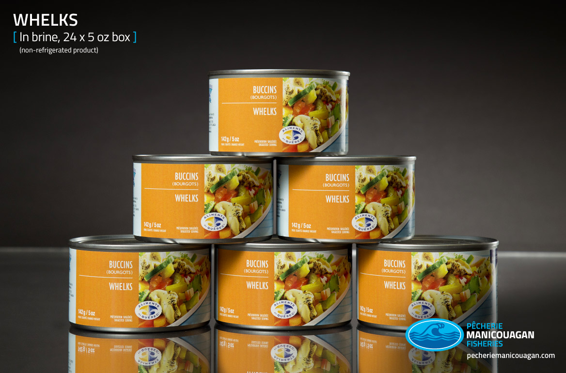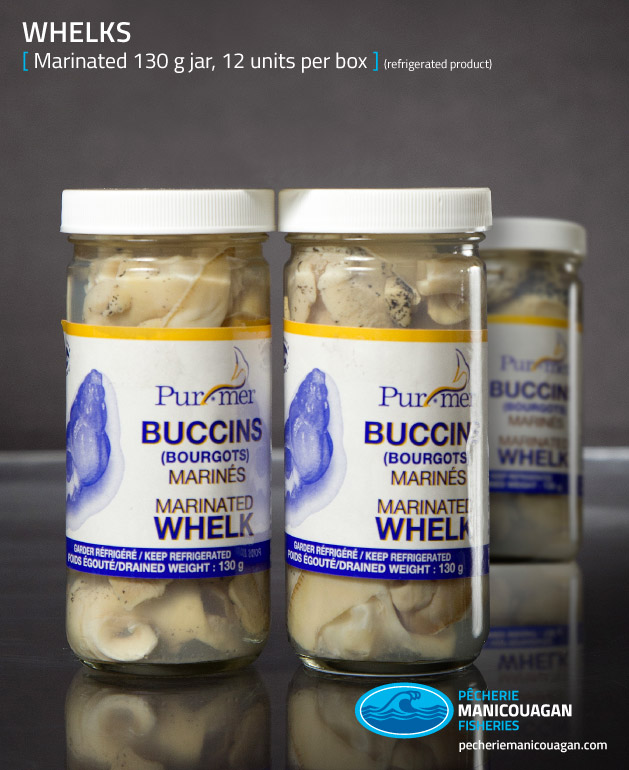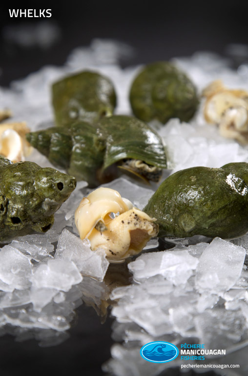 Whelks, which are very abundant in the St. Lawrence River and Estuary, are mollusks with a spiral shell and creamy white flesh streaked with black. Also known as Buccinum undatum, Whelks are caught from April to the end of September in deep waters using a series of basket traps.